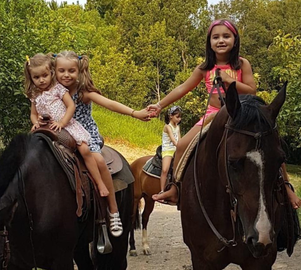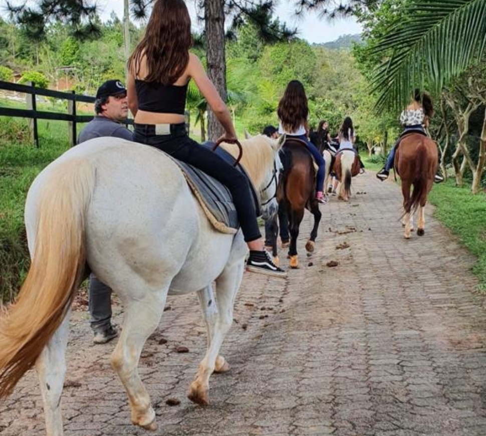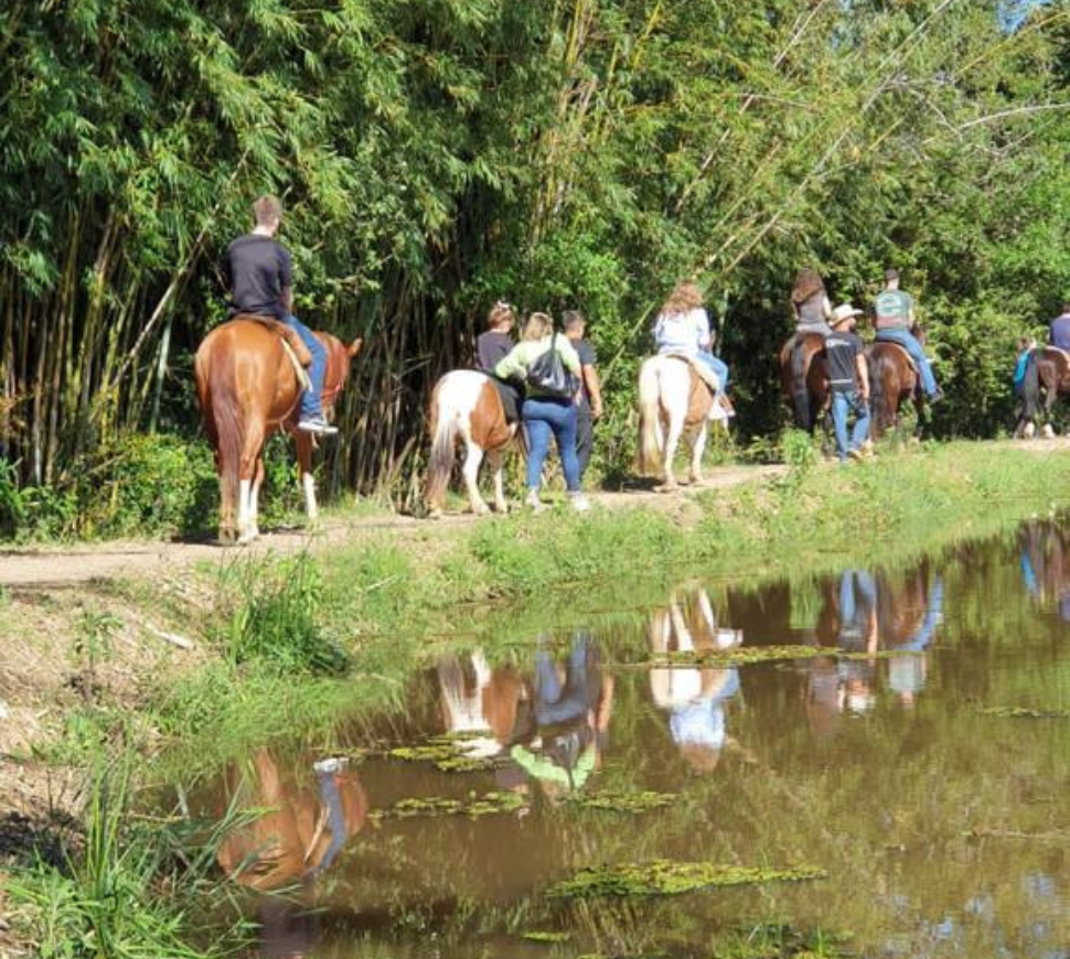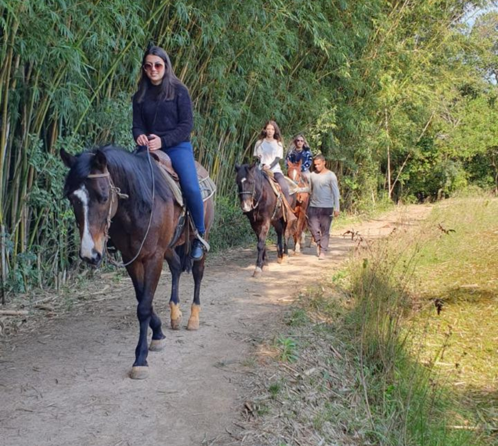 Em trilhas seguras e bem cuidadas, os participantes percorrem paisagens naturais do rancho, acompanhados por instrutores experientes e montados em cavalos dóceis, ideais para adultos e crianças.